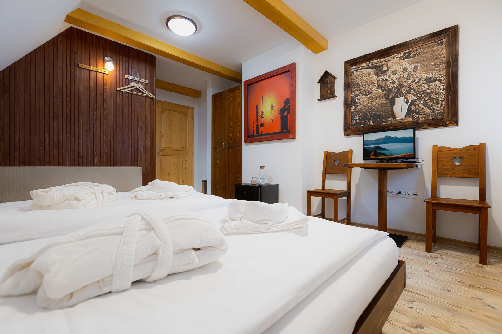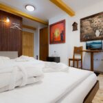 - Každá izba má svoju vlastnú dizajnovú kúpeľňu s toaletou, podlahové vykurovanie, sprchový kút alebo vaňu, konferenčný stolík, káblovú TV a WI-FI internetové pripojenie 150/150 Mbps.