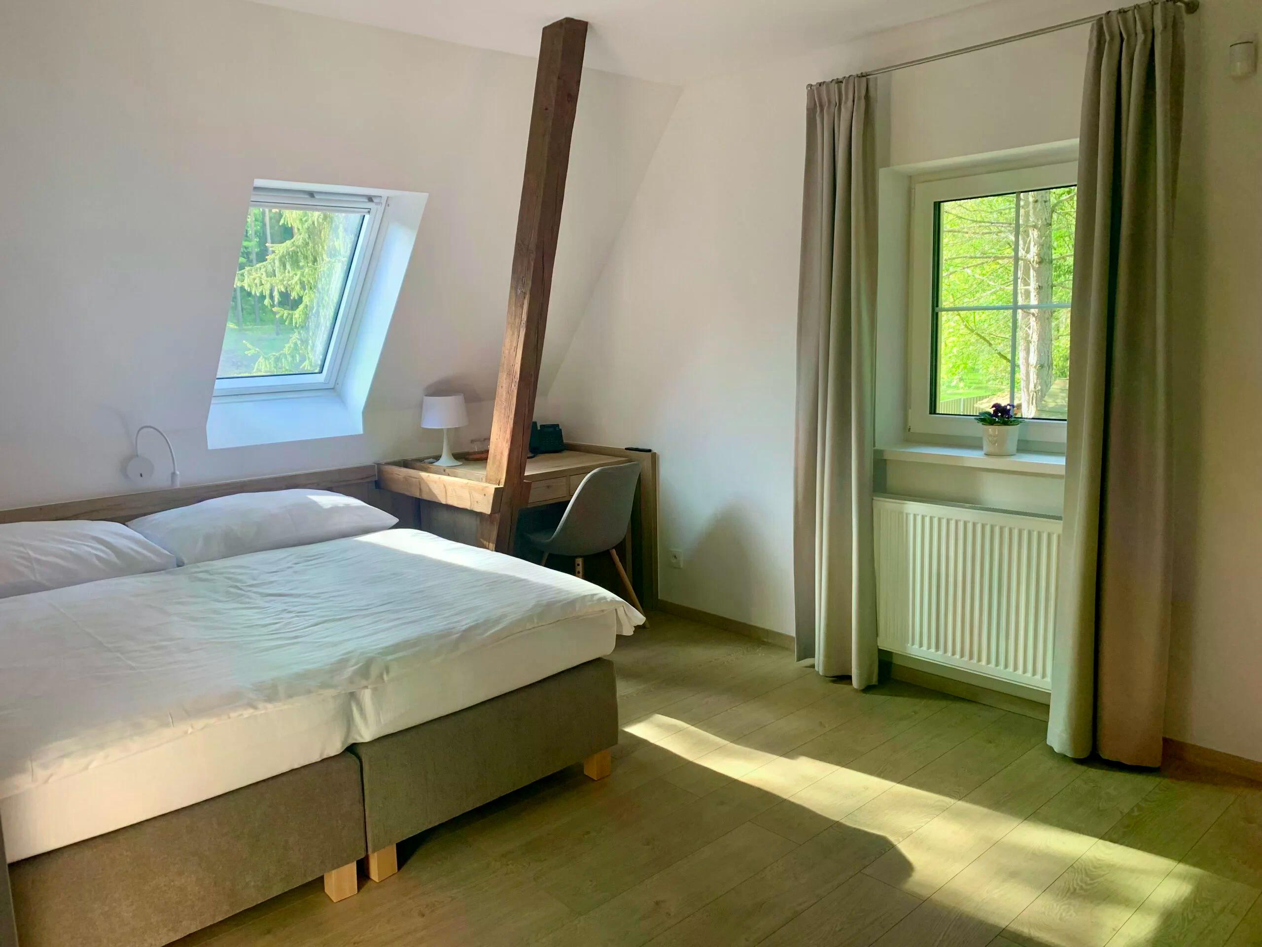 - Dvojlôžková izba v Dome Lúč zaujme svojou novotou a moderným dizajnom. Každá izba disponuje možnosťou oddelenia postelí, vlastnou kúpeľňou so sprchou a WC, klimatizáciou a spoločnou terasou s vlastným sedením. Izba je vhodná pre páry, ale aj trojčlenné rodinky s jedným menším dieťaťom na zdieľanej manželskej posteli. Užite si príjemný pobyt v krásnom, úplne novom a čistom prostredí.